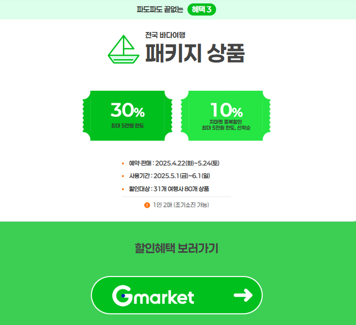 | 패키지 여행 할인 | 섬·연안 투어 포함 | 최대 50,000원 |