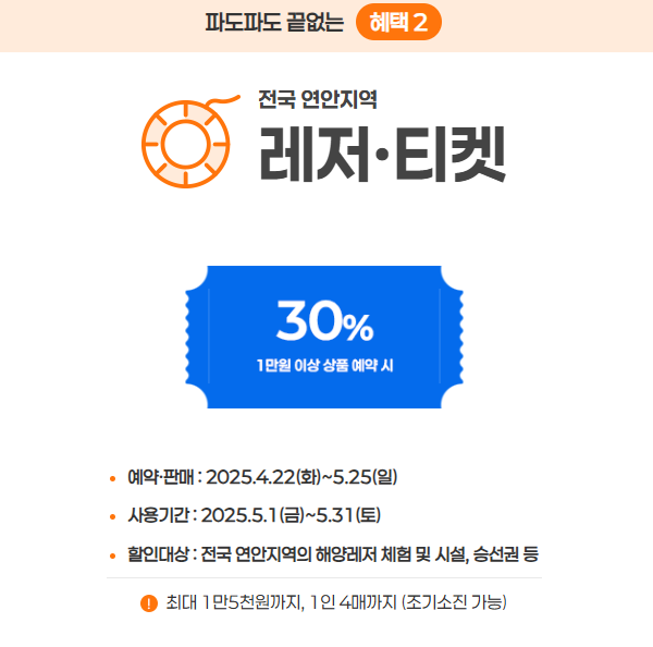 | 레저·입장권 할인 | 지역 관광상품, 액티비티 | 최대 15,000원 |